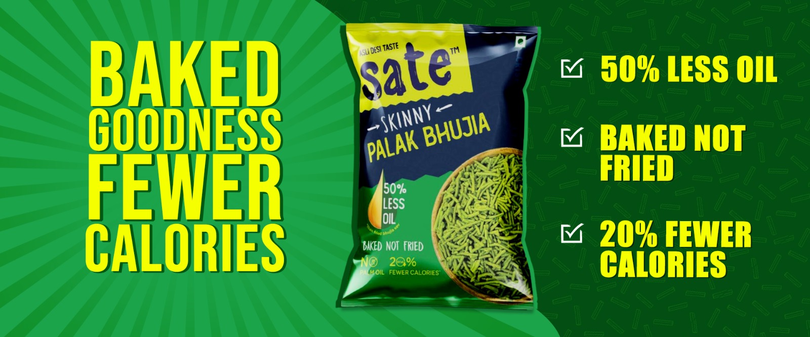 • Assorted Sate snacks featuring Skinny Palak Bhujia and Protein Sev (Classic Ratlami), roasted and not fried, high in protein, low in calories, with no palm oil, ideal healthy namkeen options for online purchase